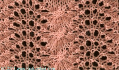 | 2 | R | * | (k2-tog) 3 times, (yo, k1) 6 times, (k2-tog) 3 times | * | |