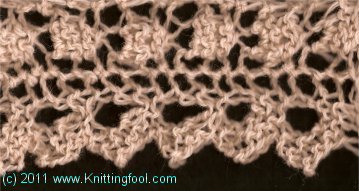 | 1 | R | Yo, p2-tog, (k1, p1, k1, p1, k1) in same stitch, yo, p2-tog, k1, (yo) 3 times, k2 |
