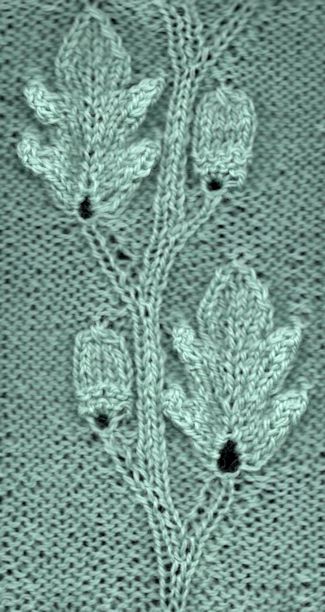 | Leaf tip Left |   | Leaf tip Left: slip 5 stitches to cn and hold in front; p3, on the five stitches from the cn (ssk, k1, k2-tog; turn, p3; turn, sl 1-k2-tog-psso)  |